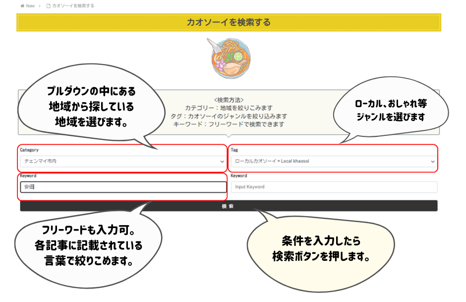 それぞれの辛さレベルを唐辛子で表現しています。個人的には3つ以上からは結構辛いのですが… 「現地の生情報を知りたい!」「マニアック過ぎて日本語で検索しても出てこない!」そんな時に便利なタイ語コピペ機能を掲載しました。各ページの最後の方に、お店の名前をタイ語で表記しています。右のボタンを押すとクリップボードにコピーされるようになっているのでぜひご活用ください! ●検索に便利なタイ語表記(右のボタンを押すとクリップボードにコピーできます!)↓ ↑こんな感じの付箋が各ページにあります。 各ページにGoogle Mapで場所のリンクをしています!マップをクリックするとGoogle Mapのアプリで見れるようになるので、行きたいところへ保存しておくのにも便利!ただし、Google自体の情報が間違えている場合もあるので注意が必要です。(特に田舎の道は案内なども要注意!) ↑このようにマップのリンクを載せてあります 管理人は既に日本に帰国してしまったので、タイの最新情報はお店のページやGoogleMapを見るようにしてますが、常にブログを更新できないので…お店のFACEBOOKがアクティブか?など、事前に調べられるようにわかる限りはリンクを貼り付けています!最新情報はお店のSNSやサイトを参照ください。 お店のFACEBOOKはこちら:Facebook ↑こんな感じでリンクを貼っていたり貼っていなかったり 検索ページで記事の絞り込み検索が可能。(※記事はこれから日々増やしていく予定です!)