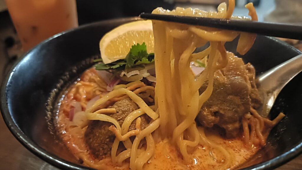 ここで食べられるのはお店は、牛スジのカオソーイ!
