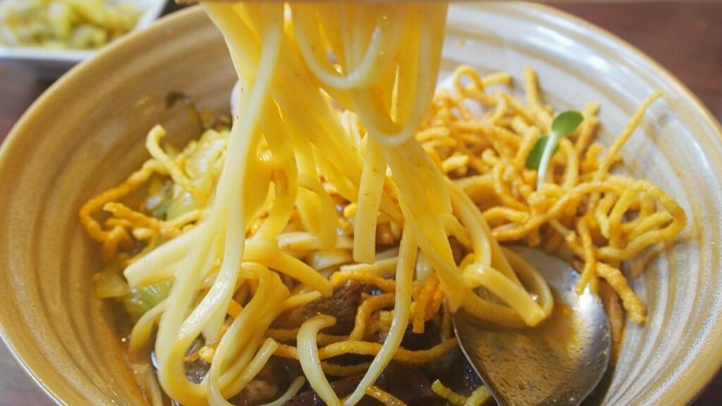 カオソーイの麺は、つるんとした雲南スタイルの麺だけど、形は平麺。とっても美味しい。